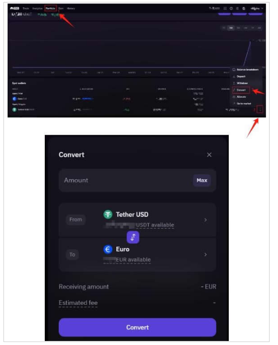 5、在个人看板usdt资产点击三个点,选择转换将usdt转换为欧元Euro,实时汇率