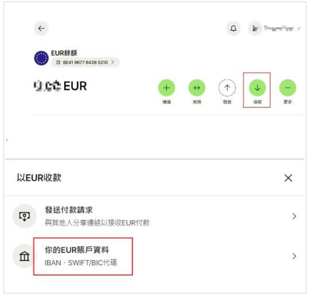 8、首页点击欧元账户,点击接收,继续点击查看欧元账户资料