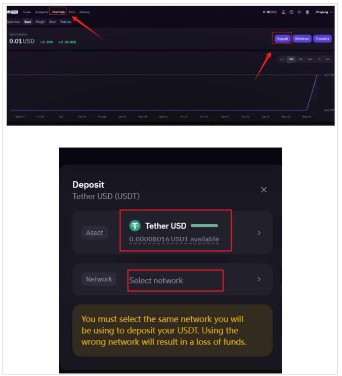 4、实名认证成功后,来到首页进入个人看板里点击存款入金usdt(根据自己选择相应网络)