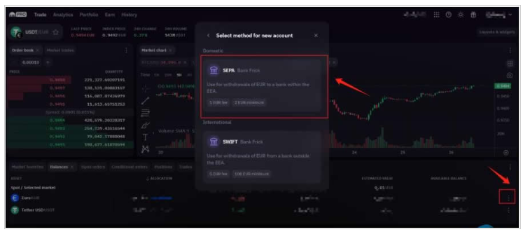 6、兑换欧元后就可以开始转账到wise,还是在个人看板点欧元资产的三个点(…)后点击withdraw提现,接着点击添加提现账户add withdraw account,选择**个SEPA(因为wise是英国的,所以属于EEA欧洲经济区)
