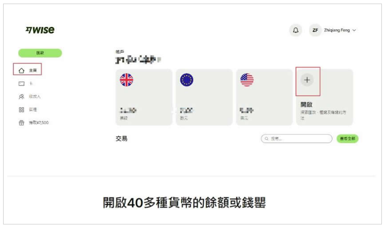7、为了填上图的账户银行信息,点击来到wise首页,如果没有欧元账户就点击开户,先开一个欧元账户