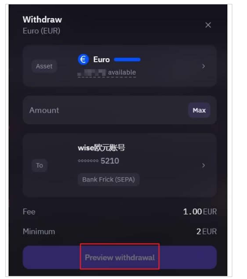 10、输入提现数量,点击提现预览,提现。就成功的将资金通过kraken转账到了Wise。