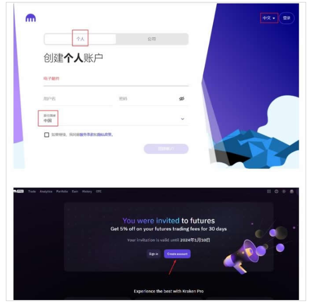 1、打开Kraken平台(https://www.kraken.com),语言切换到中文,选择个人账户,居住****,创建账户