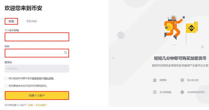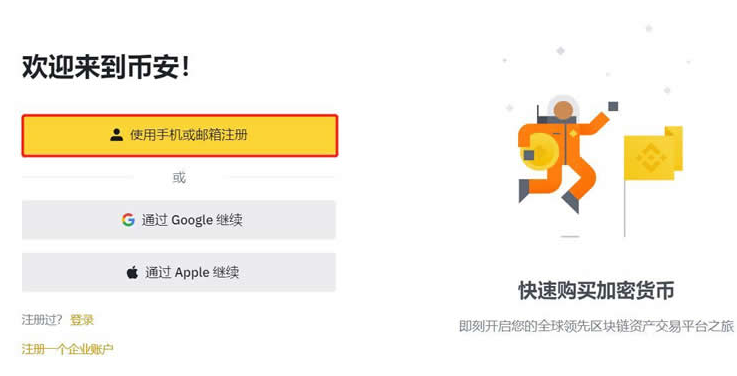 今天小编将以在币安交易所进行购买BTC为例,为广大投资者介绍新手炒币怎么入门?详细流程见下文:1、在首页点击【使用手机或邮箱注册】进入注册页面 (、)
