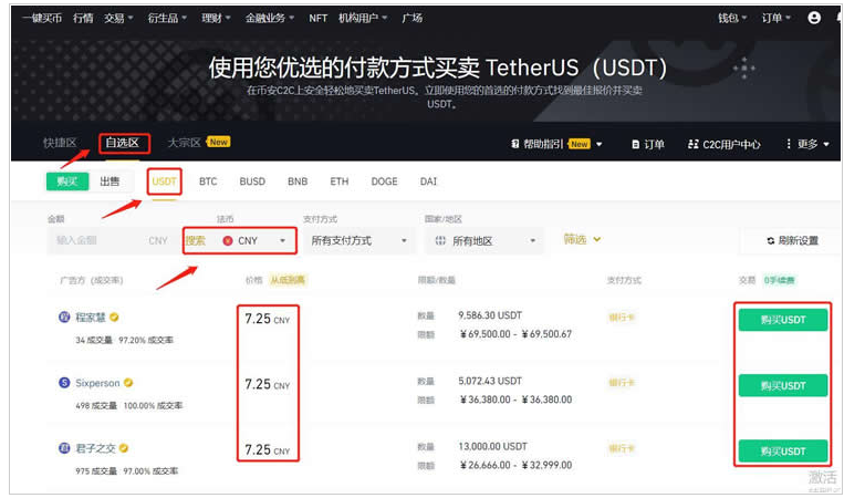 7、选择【自选区】币种选择【USDT】法币选择【CNY】根据金额、支付方式选择合适商家,点击商家右侧的【购买USDT】
