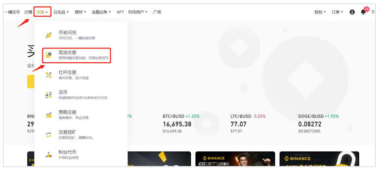 9、获得USDT后,选择【交易】——【现货交易】进入交易页面