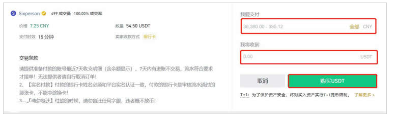 8、在弹窗中输入支付金额,可以看到要收到的USDT,点击【购买USDT】