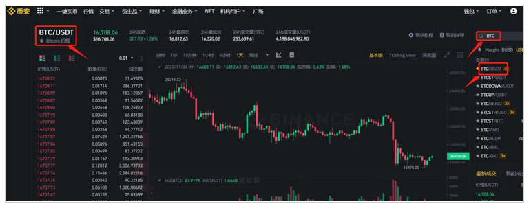 10、在右侧搜索栏输入币种简称BTC,选择BTC/USDT