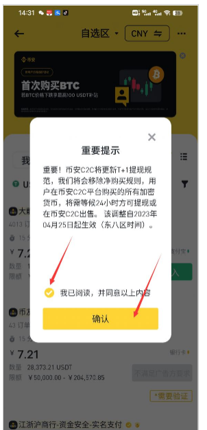 此时会弹出重要提示如下,注意为了保护用户安全,现在币安C2C购买的加密货币都遵守T 1规则,也就是买到之后要等一天才能提走,避免有坏人用黑钱来买币**,勾选同意,点击确认: