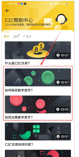如下图所示,在C2C帮助**,提供了视频教程,大家可以看下“如何购买数字货币?”和“如何出售数字货币?”这两个视频教程。讲解都是中文,讲的很详细易懂。