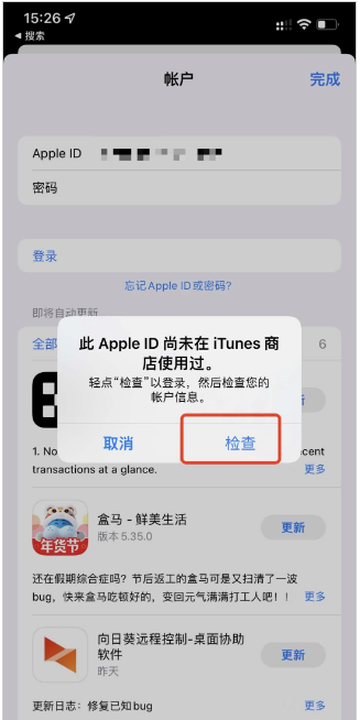 七、登陆后会提示此 ID 需要完成**检查,点击「检查」(如果没有自动出此弹窗可重新登陆或者去商店随便搜一个免费的软件进行下载它会自动弹出来)