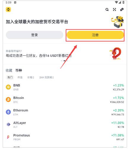 1.打开币安App (、),点击【注册】。