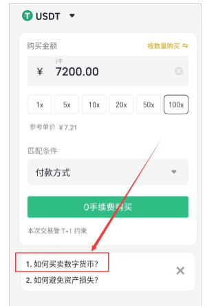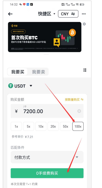在快捷区用法币兑换加密货币超级简单,如下图所示,你只需要在我要买这里,选择要购买的加密币种,默认是USDT,输入要购买的法币金额,**的单位是72元,我们点选100×,就是要买7200元的,然后点击下面的0手续费购买,就会调出你之前设置的支付方式,选择用银行卡、支付宝、微信进行支付即可。