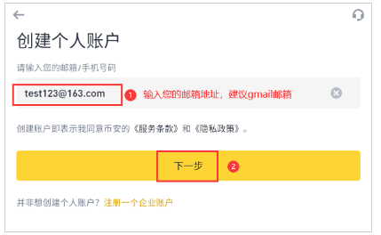 * 邮箱: 输入你常用的邮箱,币安会向该邮箱发送验证邮件。