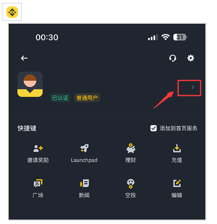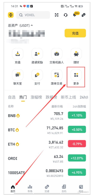 1.登录币安App 在首页点击下图红箭头所指的更多: