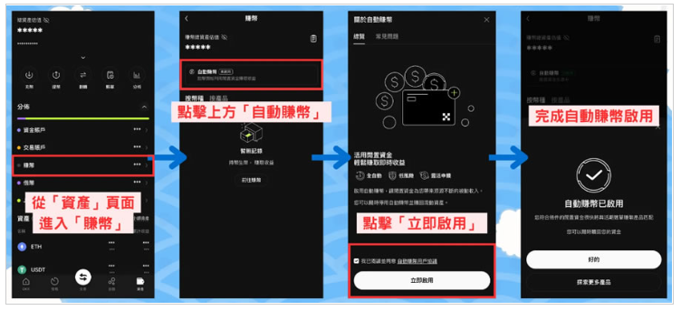 只要从「资产」页面,进入「赚币」,接着点击页面上方的「自动赚币」,然后点击「立即启用」这样就开启自动赚币功能了。