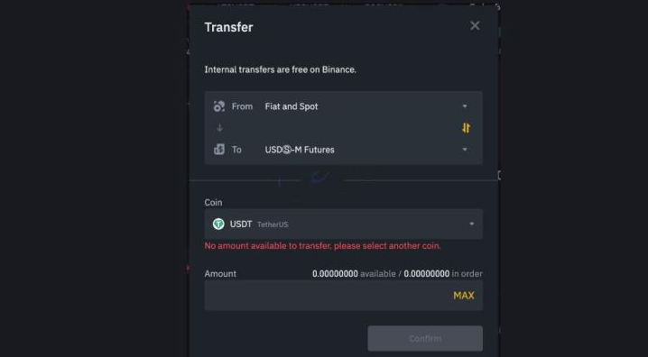 4、设置想划转的金额与要使用的钱包,然后点击【确认】。相应的余额很快就会转入合约钱包。如有需要,您也可以反向从合约钱包中划转出资金到币安内部其他钱包。
