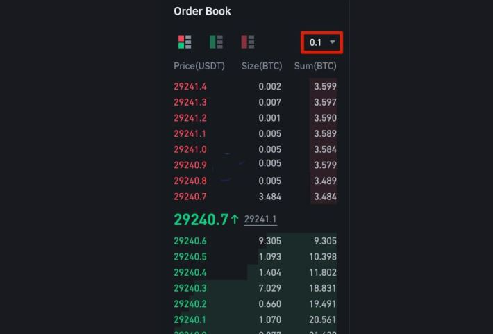 7、查看实时订单簿数据。在该区域右上角的下拉菜单中可以调整订单簿的**度(默认为0.01)。在平台上实时查看**成交信息。