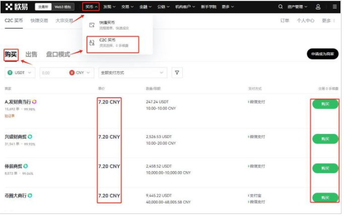7、进行交易前需要拥有USDT,可在C2C买币进行交易,根据需求选择合适商家,点击“购买”,而后根据提示进行付款、等待商家放币(若是长时间没有收到币种,可联系客服进行处理)