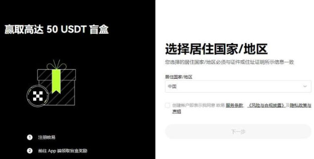 3、选择居住**/地区,勾选服务条款、《风险与合规披露》及隐私政策与声明
