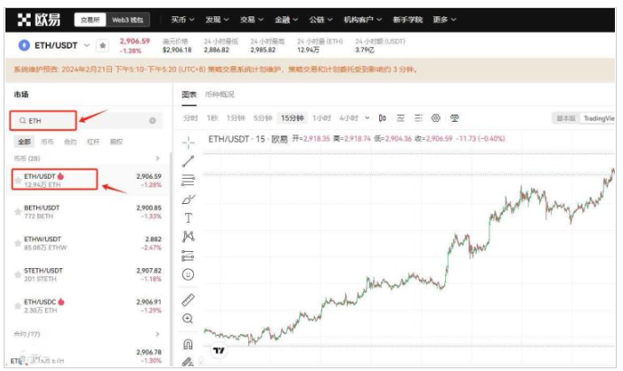 9、在搜索框输入ETH,选择ETH/USDT交易对,可以看到ETH实时行情