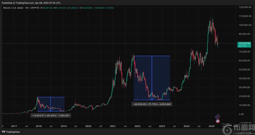 从历史数据来看,比特币的熊市通常出现在减半后的调整期或全球经济动荡时。例如,2018年的漫长熊市和2022年的加密寒冬都伴随着价格从高点暴跌70%-80%,并持续数月甚至数年。