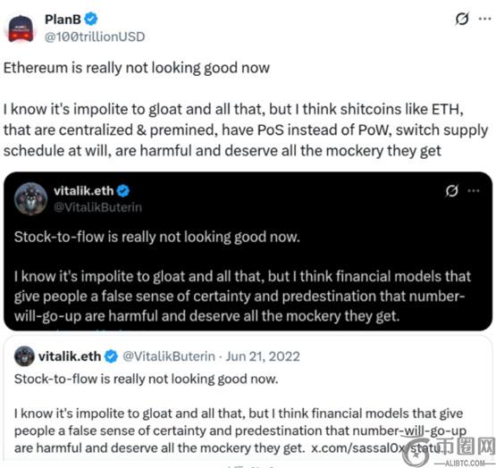PlanB讽刺性地转发了Buterin在2022年6月的X平台帖子,Buterin在帖子中表示S2F“现在看起来真的不好”。PlanB则回应称,“以太坊现在真的看起来不好”。