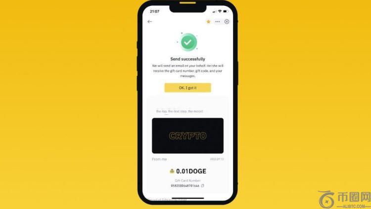 7、也可以用币安礼品卡的转账加密货币功能,给您的亲朋好友发送任意数量的加密货币,这种方式也不收取手续费,适合**场合,且无论他们身处何处都可以。