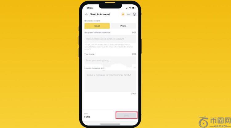6、如需通过币安账户直接分享礼品卡,请点击【通过账户发送】,然后输入与收件人币安账户绑定的电子邮件地址或电话号码,然后点击【发送】即可
