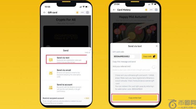 4、然后会请您选择通过电子邮件、短信还是直接到账的方式来交付礼品卡。请选择喜欢的方式进行验证。例如,通过短信分享礼品卡,请点击【通过短信发送】。然后,点击【复制整个文本】,粘贴文字并发送给收件人