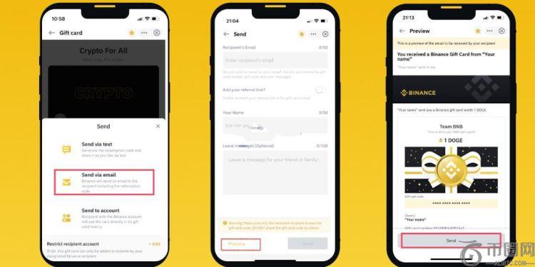 比特币赠送给别人常见方式就是借助礼品卡趋势线,例如礼品卡,用户只要拥有已认证的币安账户且所在地区支持该礼品卡产品,均可通过安全便捷的数字礼品卡向全球各地的亲朋好友送出加密货币,并且币安礼品卡手续费极低,灵活性无可比拟,非常适合附上个性化留言向他人赠送加密货币。下文是具体的比特币赠送给别人教程讲解: