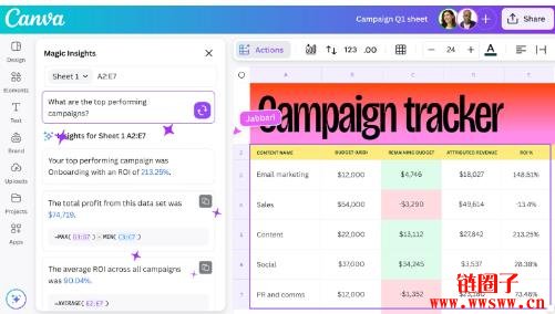 对于资料视觉化爱好者,Canva 推出 Magic Charts,只要汇入数据,即可自动产出动态图表。而搭配全新 Canva Sheets,透过 Magic Insights 和 Magic Formulas,使用者仅需简单文字输入,系统便可自动生成分析结果与报表视觉设计。