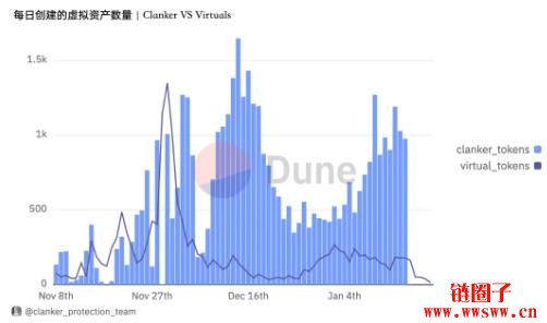 截至2025 年1 月16 日,Dune 数据显示Virtuals Protocol 上已创建超过15000 个虚拟资产,Clanker 上则发行了超过42000 个数字资产。