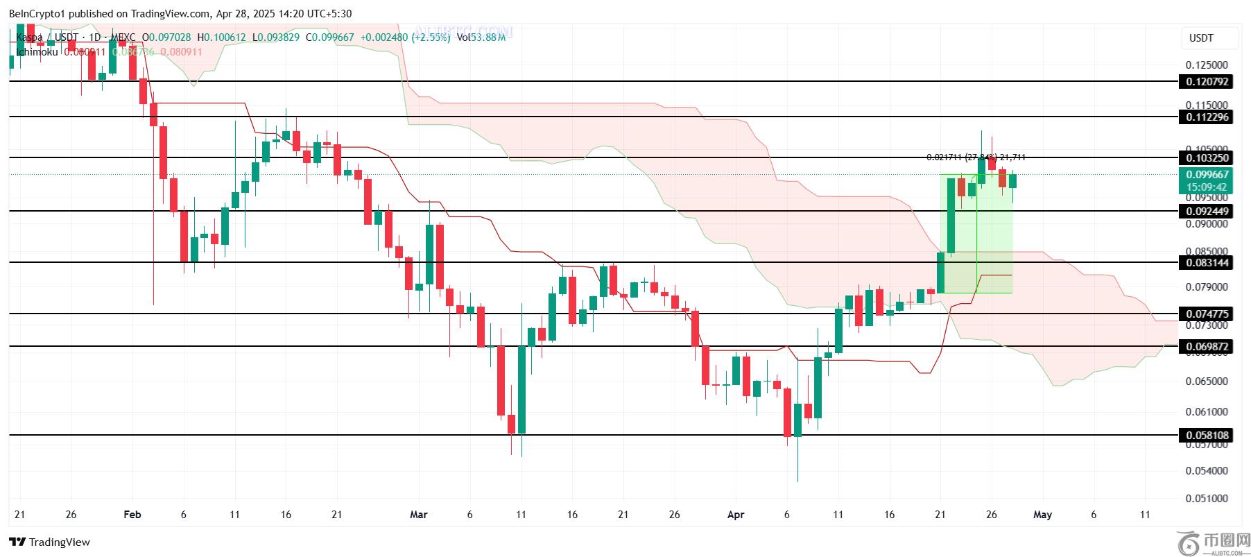 KAS 在过去一周上涨了 27%,这在**程度上抵消了 Ichimoku 云图的看跌信号。目前,该山寨币交易价为 0.099 美元,接近 0.103 美元的关键阻力位。如果这种势头持续下去,KAS 有可能突破并形成新的看涨趋势。