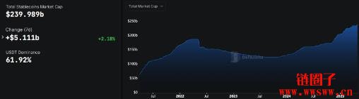 根据DeFiLlama,链上稳定币市值也持续创新高。