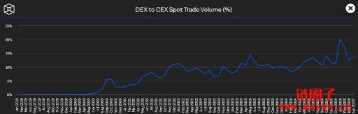根据the Block,DEX 相较CEX 交易量占比呈现上升趋势。