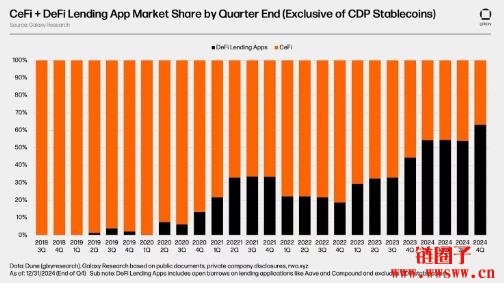 根据Galaxy Research,在加密货币借贷市场中,DeFi 市场占比已超越CeFi。