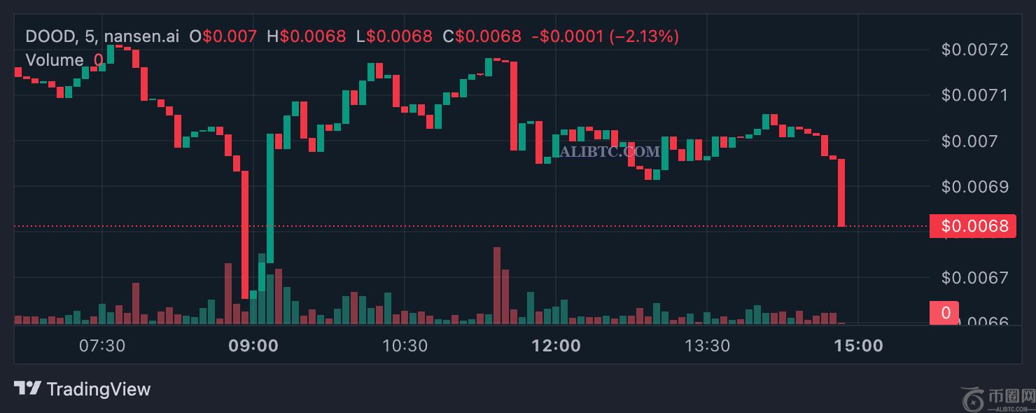 5 月 9 日至 5 月 12 日期间,DOOD 鲸鱼持有量从 69,202 枚大幅跃升至 2.5 亿枚,表明早期大量增持。在过去 24 小时内,该**记录了 5,509 笔交易,交易量为 734,000 美元。