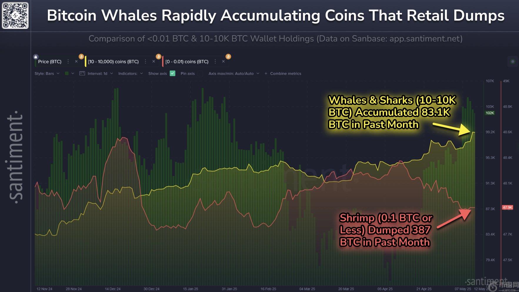 桑蒂门特 的链上数据表明,即使比特币价格持续攀升,大型比特币钱包仍在积累 BTC,而小型持有者则在减少持仓。