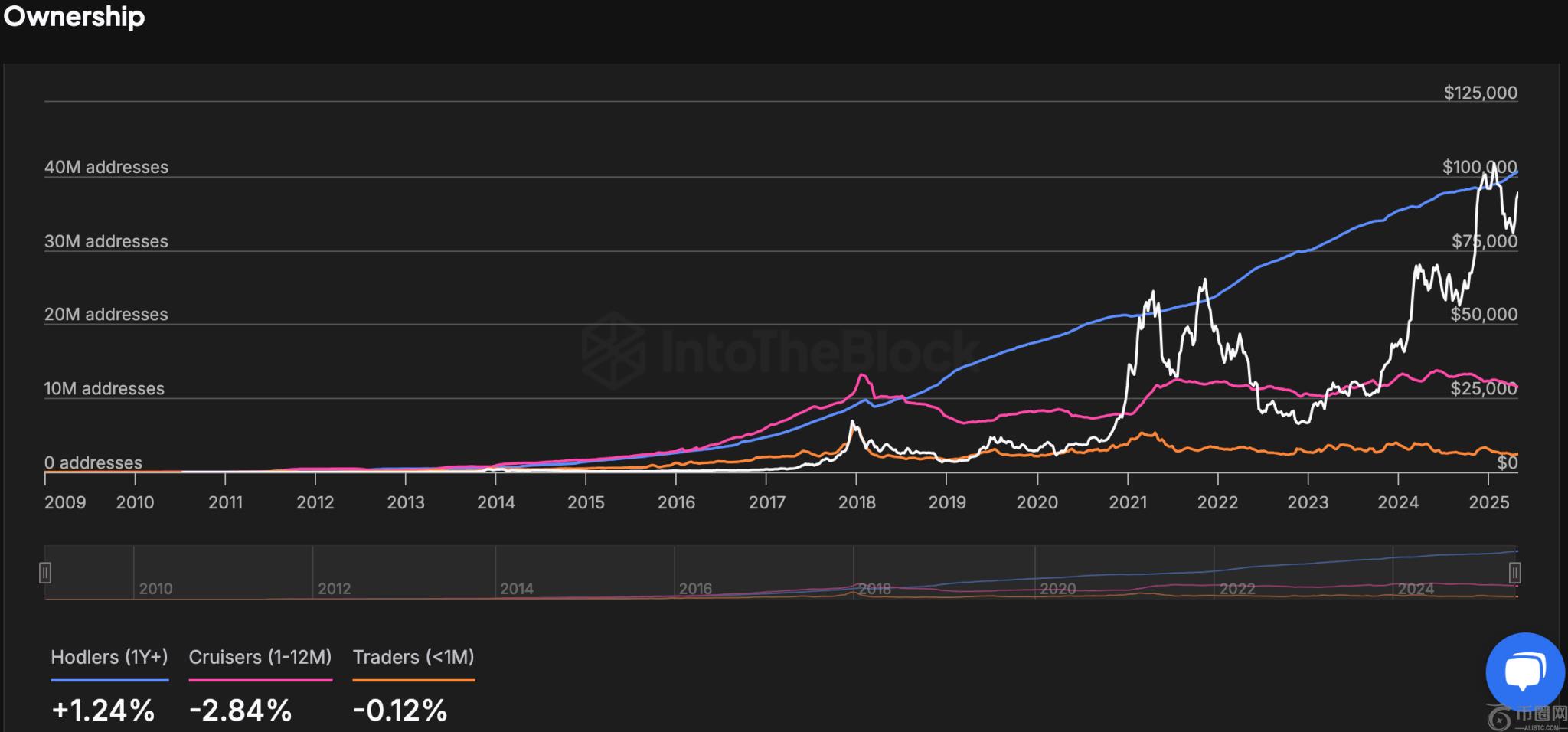 分析公司 IntoTheBlock 的额外洞察证实,比特币持有者持有资产的时间长短会发生变化。长期持有者(持有比特币超过一年的人)近期的持币量变化幅度为 1.24%。这表明,通常与“鲸鱼”相关的投资者群体正在持续增持。