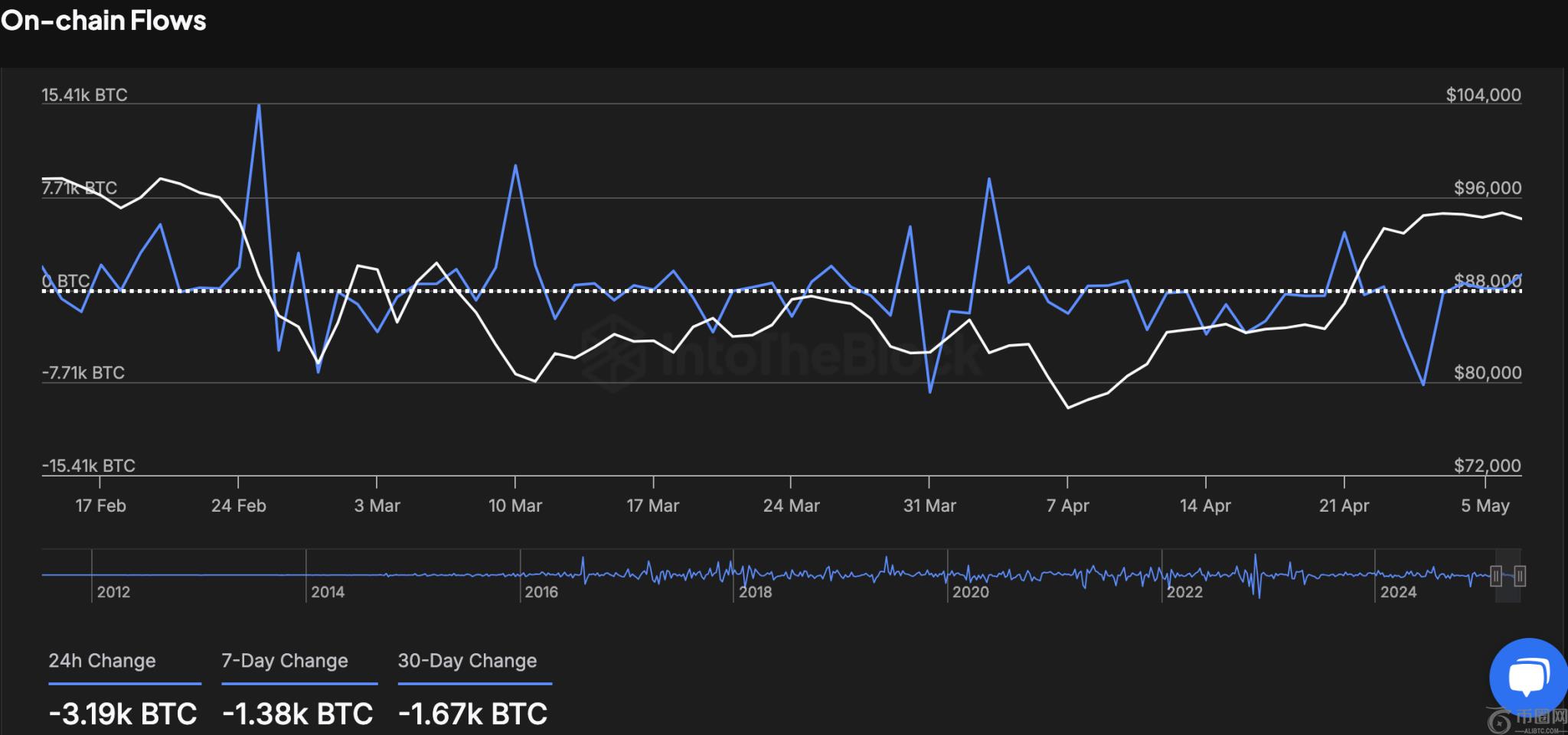 过去 24 小时内,各交易所净流出 3,190 BTC。7 天净流出量达到 1,380 BTC,而 30 天净提现量为 1,670 BTC。