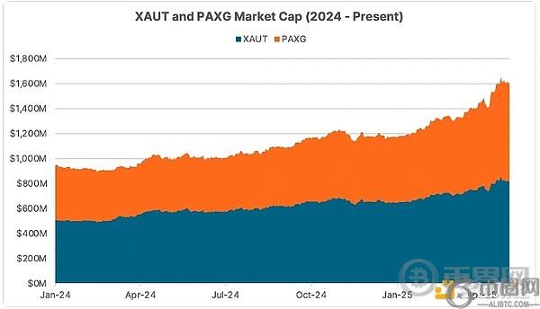 加密货币也受益于这一趋势,因为我们的市场上早已存在**化的黄金,其中最主要的是Tether Gold (XAUT) 和 PAX Gold (PAXG)。虽然XAUT和PAXG各自的流通量仅略有增加,但自2024年初以来,它们的市值分别增长了59%和78%,截至4月底,总市值已达到16亿美元。