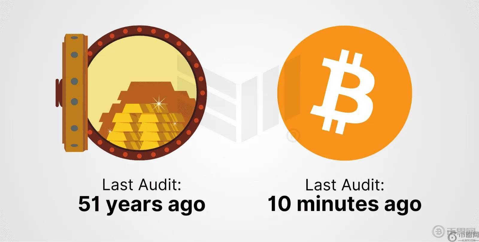 比起传统审计依赖的第三方信任机制,比特币实现了无需信任、公开透明的链上验证。**人都可实时独立验证区块链数据,「不要相信,要验证」成为比特币的共识原则。