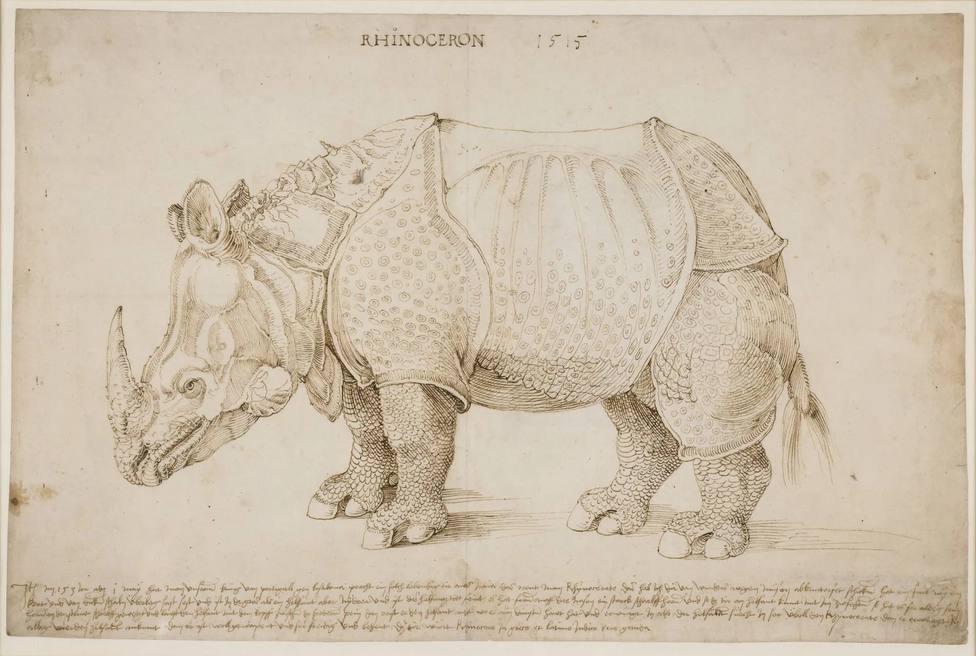阿尔布雷希特·丢勒,《犀牛》,1515年,钢笔和棕色墨水,27.4 x 42厘米(© 伦敦大英博物馆信托基金)
