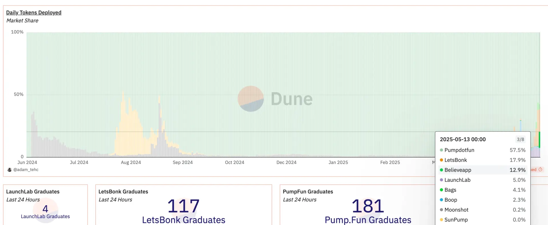 LetsBonk、Believe 和 LaunchLab 等平台在 Solana memecoin launchpad **活动中,已经超越了 Pump.fun。数据