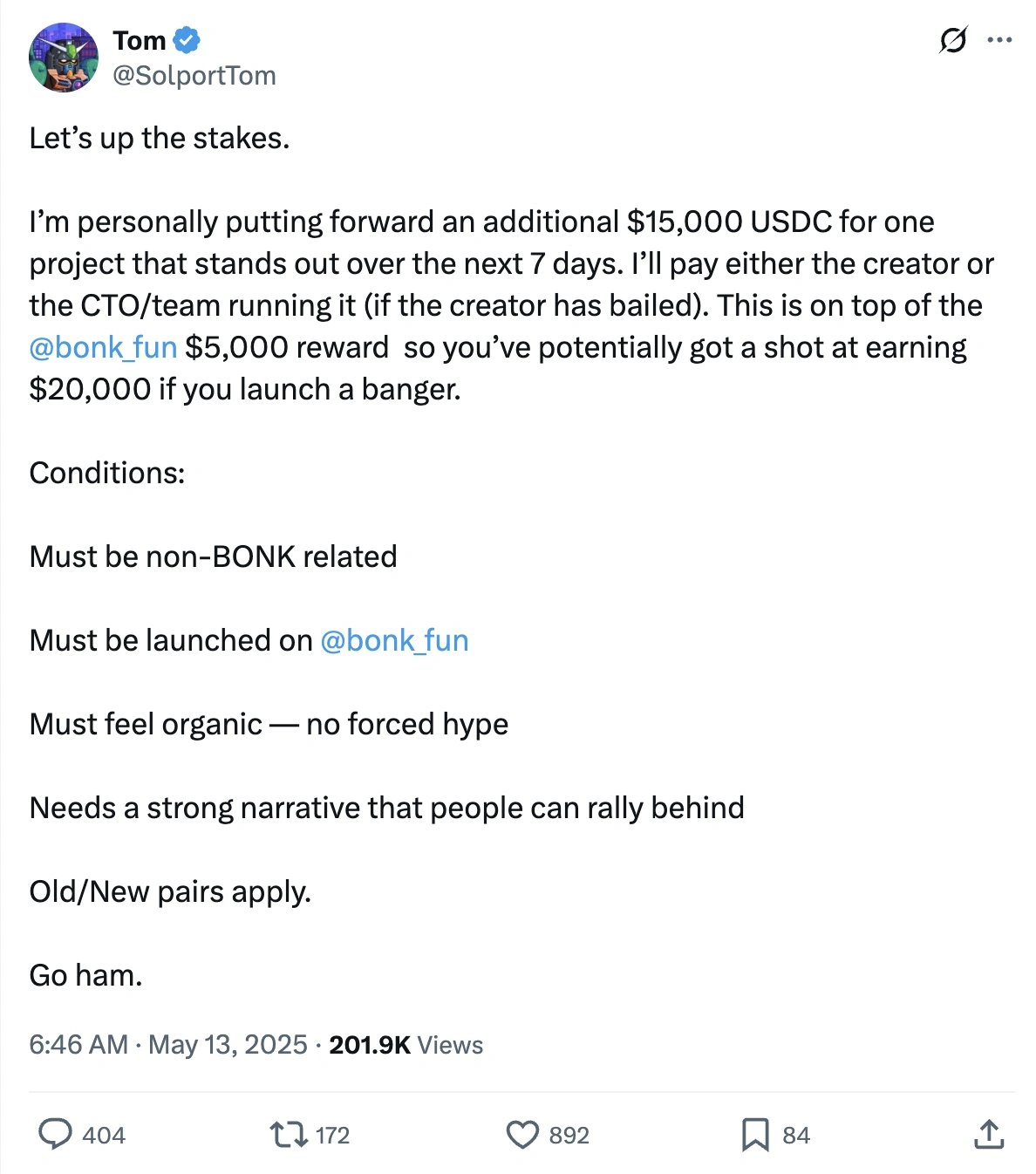 像 LetsBonk 这样的竞争对手也为创作者提供奖励,甚至还举办了一场比赛,由 SolportTom 领导,他继续鼓励人们在 LetsBonk 平台上创造新的有机模因。