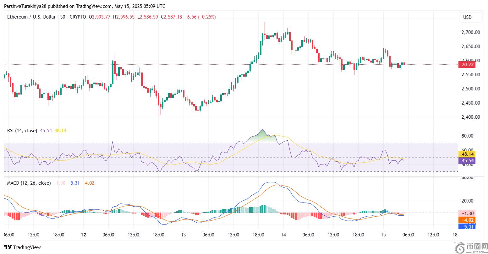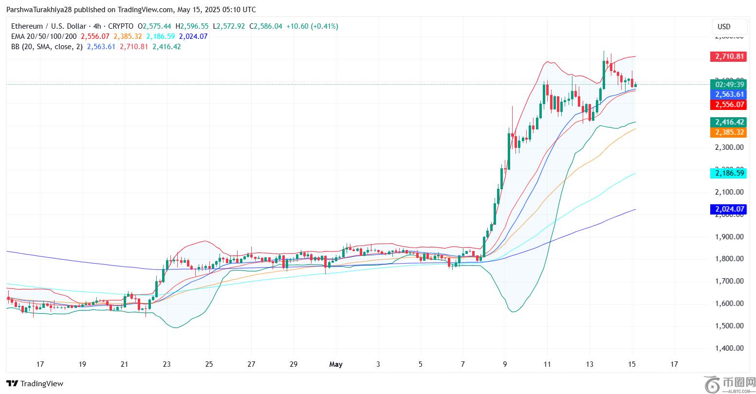 以太坊价格强势突破 2,000 美元区间后,目前交易价为 2,585 美元,在 2,710 美元附近遭遇阻力后小幅回落。4 小时图上,ETH 正在下行通道内盘整,多头守护着 2,560-2,570 美元区域,该区域与 20 日均线和布林线中线重合。该区域目前构成动态支撑位。