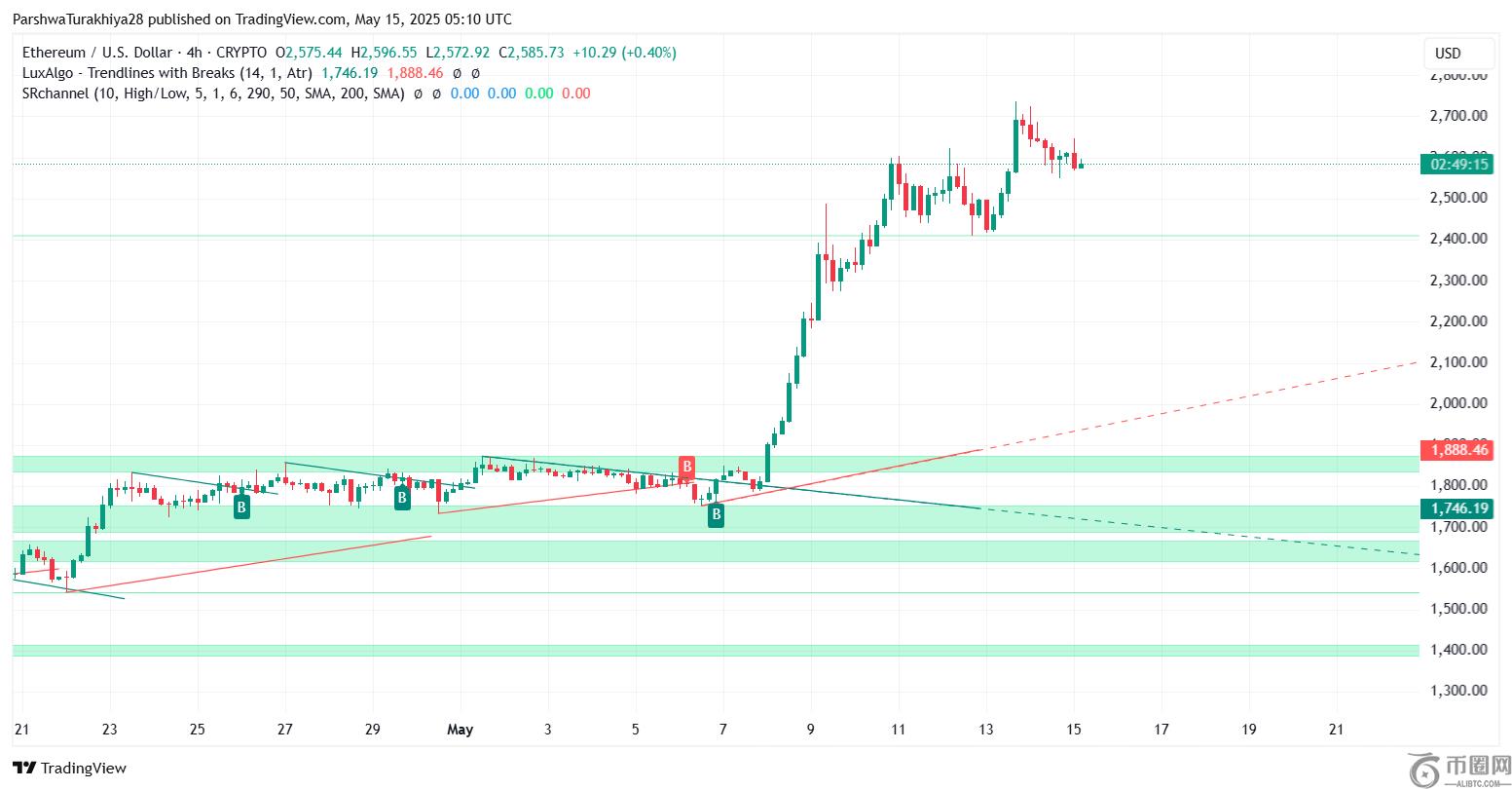在我们的5月14日ETH分析之前,我们强调了 ETH 有可能收复 2,500 美元并迈向 2,700 美元。这一设定精准地印证了看涨倾向。目前,由于 ETH 正处于窄幅区间波动,交易者应关注价格在 4H 线上方能否维持在 20 日均线上方,并准备再次上涨,还是会在 2,700 美元下方暂停并重新吸筹。