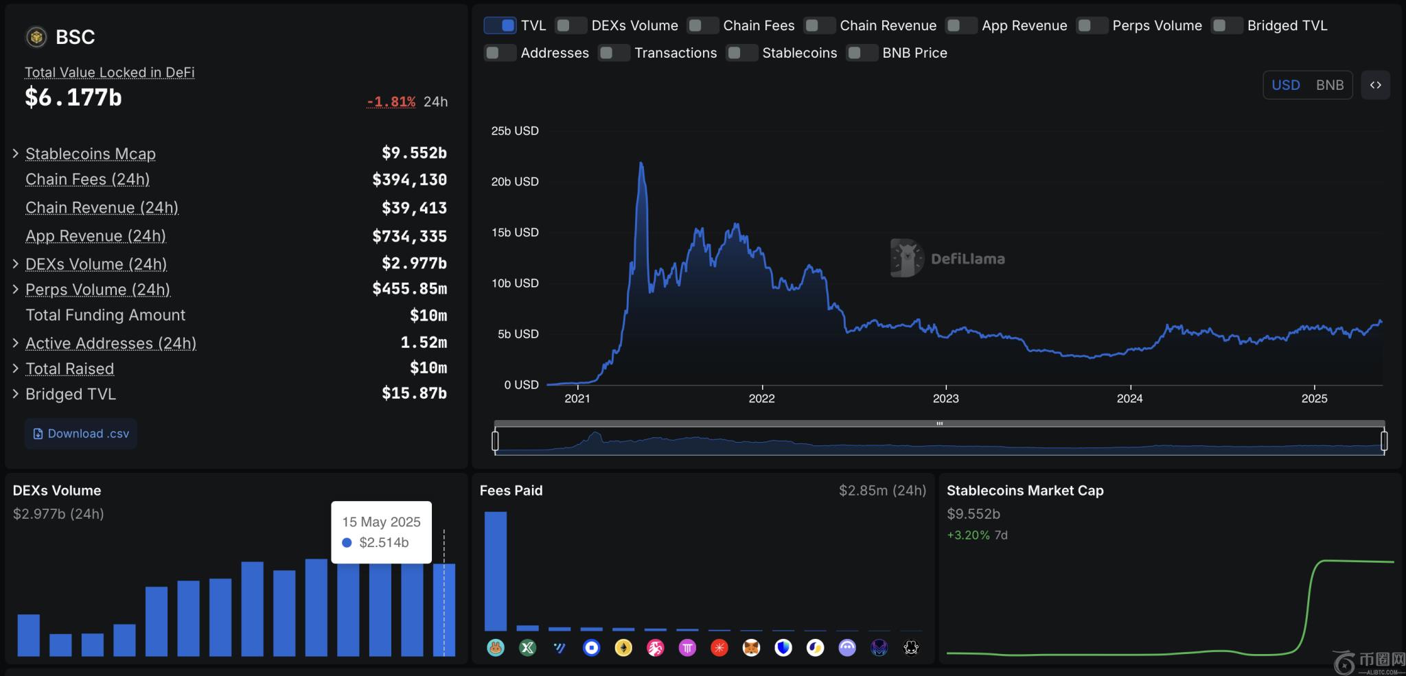 币安智能链的 TVL 和 DEX 交易量均大幅飙升,这支撑了 BNB 的看涨前景。据 DeFiLlama 称,截至 5 月 15 日,TVL 已升至 61.7 亿美元,而 24 小时 DEX 交易量则攀升至 25.1 亿美元。