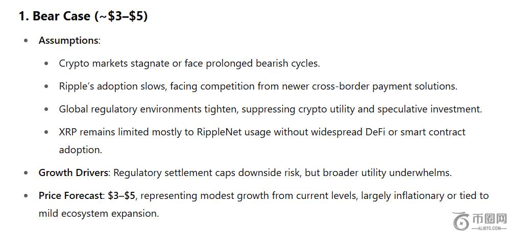 与此同时,ChatGPT 的预测略显保守,但较为乐观。在其悲观预测下,市场势头放缓,监管收紧限制增长,XRP 价格可能仅能达到 3 至 5 美元之间。